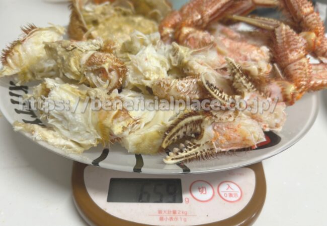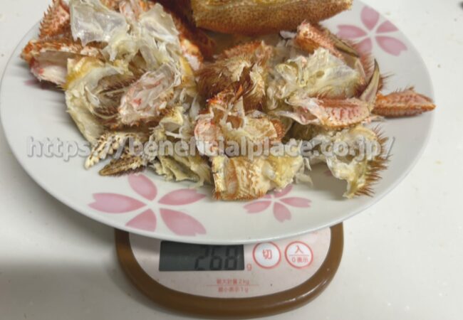 食べ終わったからを載せて量ってみると268gでしたので、391gが食べれる量だったということになります。大人4人で食べる場合ですと800g一杯の毛ガニではお腹いっぱいにはならないですね。